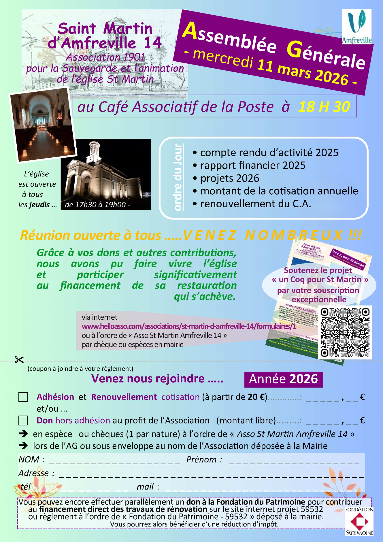 « L’association St Martin d’Amfreville tient son Assemblée Générale annuelle Mercredi 11 mars à 18h30 au Café Associatif de la Poste »